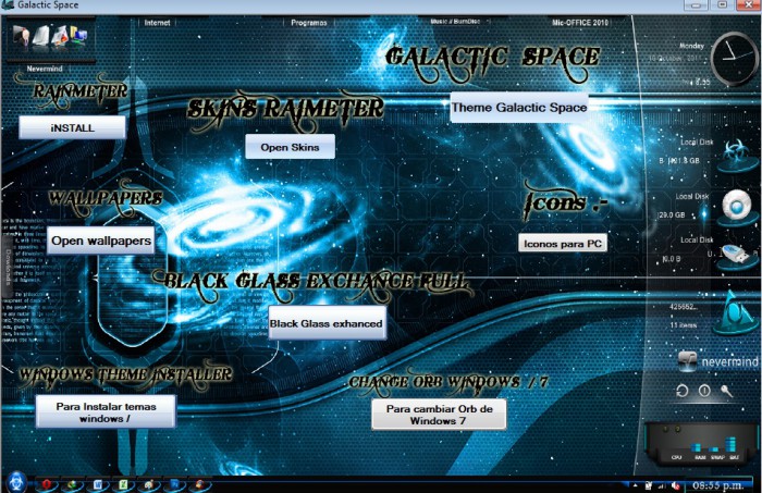 O Galactic Space contem varios recursos para personalizar o seu windows, contem por exemplo wallpapers Contem o Raimenter, você pode personalizar o seu botão iniciar e muitas outras funcionalidades não deixe de experimentar.